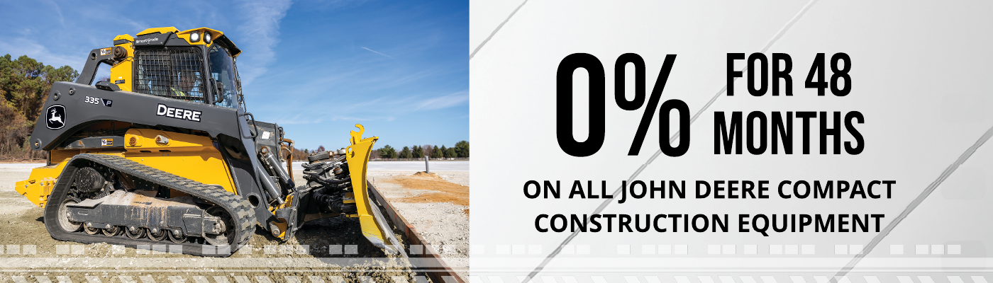 *New John Deere Compact Construction Equipment, 0% for 48 months available with approved credit from John Deere financial. Some restrictions apply see dealer for details. January 3rd 2026 through February 28th, 2026.