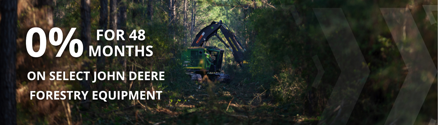 *Offer valid on eligible new John Deere Forestry equipment only. 0% financing for up to 48 months available through participating lenders for qualified buyers. Offer valid March 16, 2026 through June 30, 2026. Terms and conditions apply. See dealer for full details.